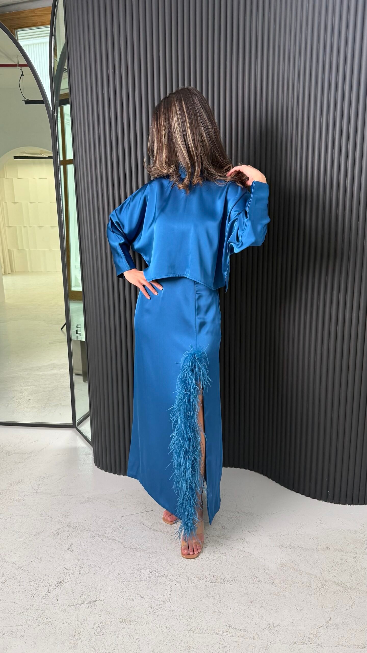 بدلة من قطعتين قميص وتنوره القماش حرير وريش